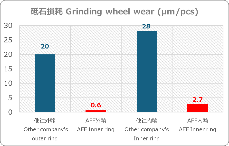 他社製一般砥石の寿命向上テストを行いAFF砥石は1/10~1/30の砥石損耗量となりました。